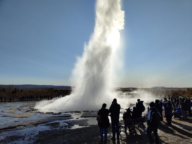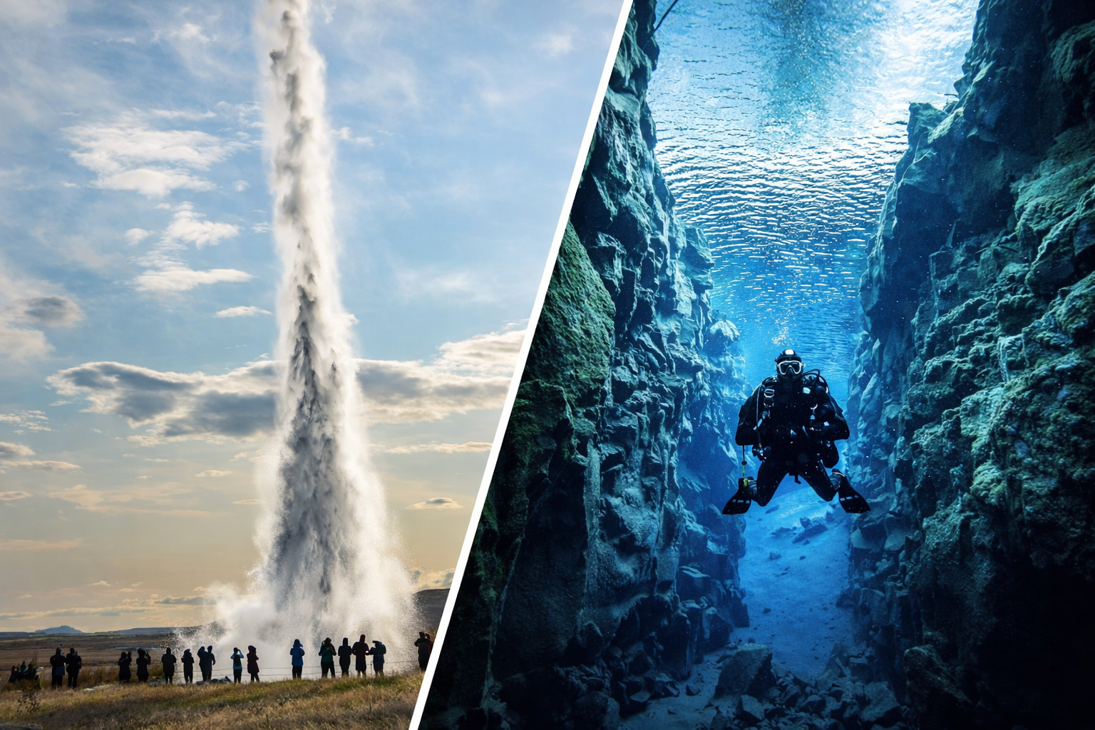 After snorkeling, the journey continues to the Geysir geothermal area to see active hot springs, followed by the powerful Gullfoss waterfall.
