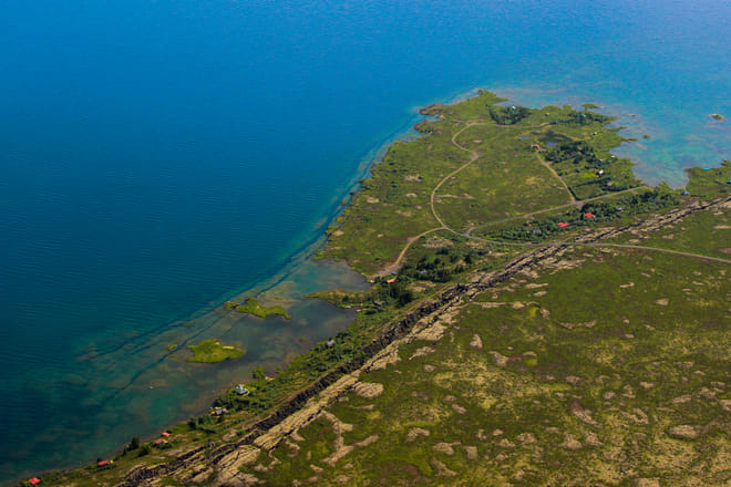 We will head out to the volcano Hengill where Hellisheiði and Nesjavellir powerplants harness geothermal energy creating electricity for the whole capital. There among the steam columns we will make a short stop at a secluded geothermal area where you can take a closer look at the bubbling hot springs. On the way back we fly along the continental rift line at Þingvellir National Park where it is possible to see clearly how the country is being pulled apart.