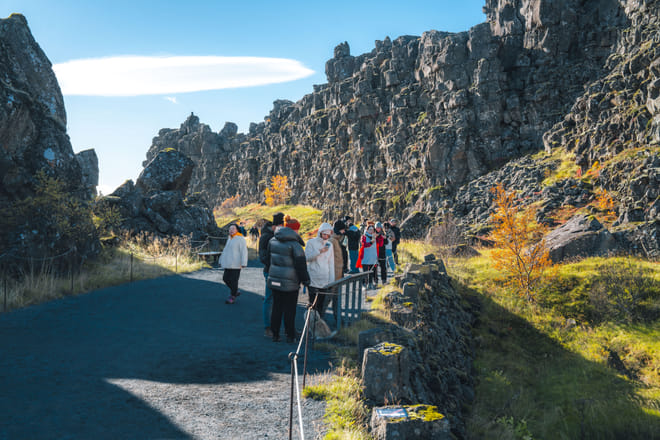 We'll begin the day with a convenient and swift pick up in designated areas in Reykjavík. We will then travel through stunning landscapes to Þingvellir National Park, a place of both natural beauty and Icelandic history. Here, we’ll walk between the slowly drifting Eurasian and North American tectonic plates and explore the rift valley where the Alþingi, the world’s oldest parliament, was founded in 930. We’ll stop at the Law Rock (lögberg), where laws were once proclaimed, for an unforgettable photo opportunity.