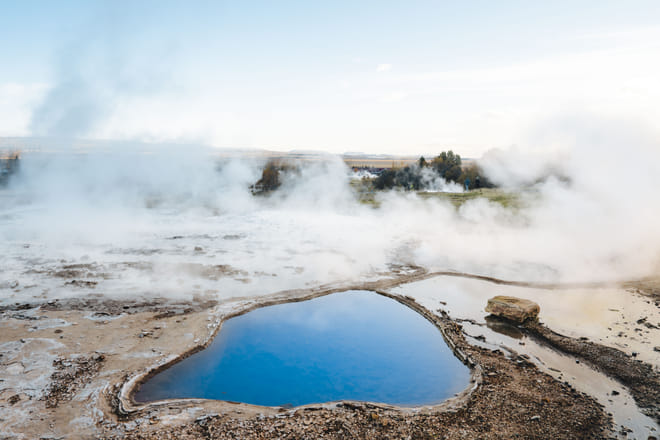 We will then visit Gullfoss, Iceland’s most famous waterfall, where the glacial Hvítá River plunges 32 meters in two stages through a dramatic canyon. Feel the spray on your face and marvel at the golden-hued mist that gives the “Golden Falls” their name—truly a breathtaking sight.