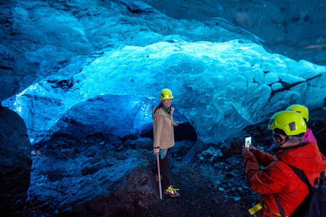 At the Sólheimajökull parking lot, you gear up with crampons, helmet, harness and ice axe, and step onto the ice. Hike across ridges, crevasses, and a glacier lagoon while learning how these formations are created. Then venture into the glacier’s ice cave—an otherworldly chamber of vivid blue ice and natural wonder.