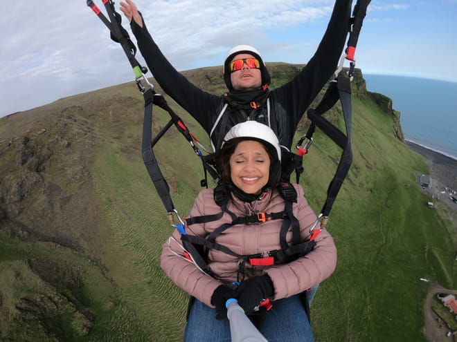 This tour starts in Vík. A tandem flight is an introductory paragliding flight. As a passenger you need no prior knowledge, just come with us and experience the world from a bird's eye view. This tour will take you in the sky high above the beautiful village of Vik in south Iceland.